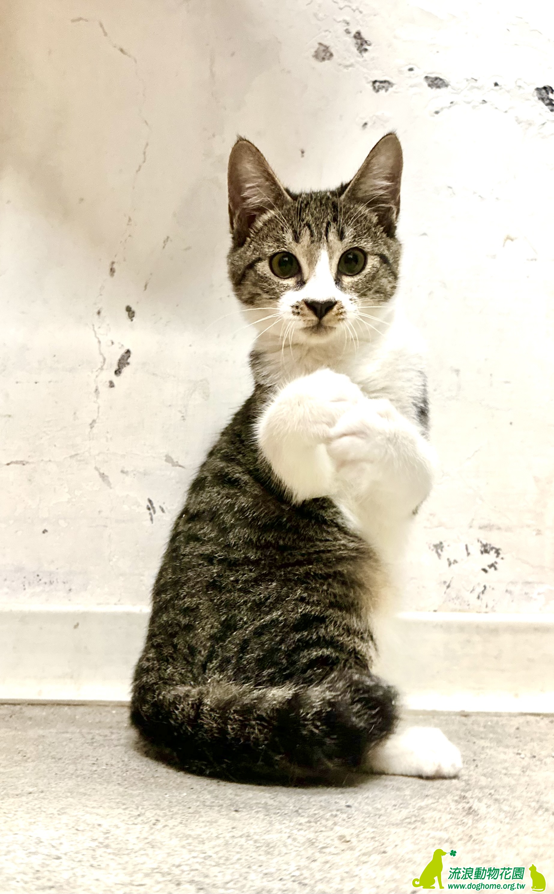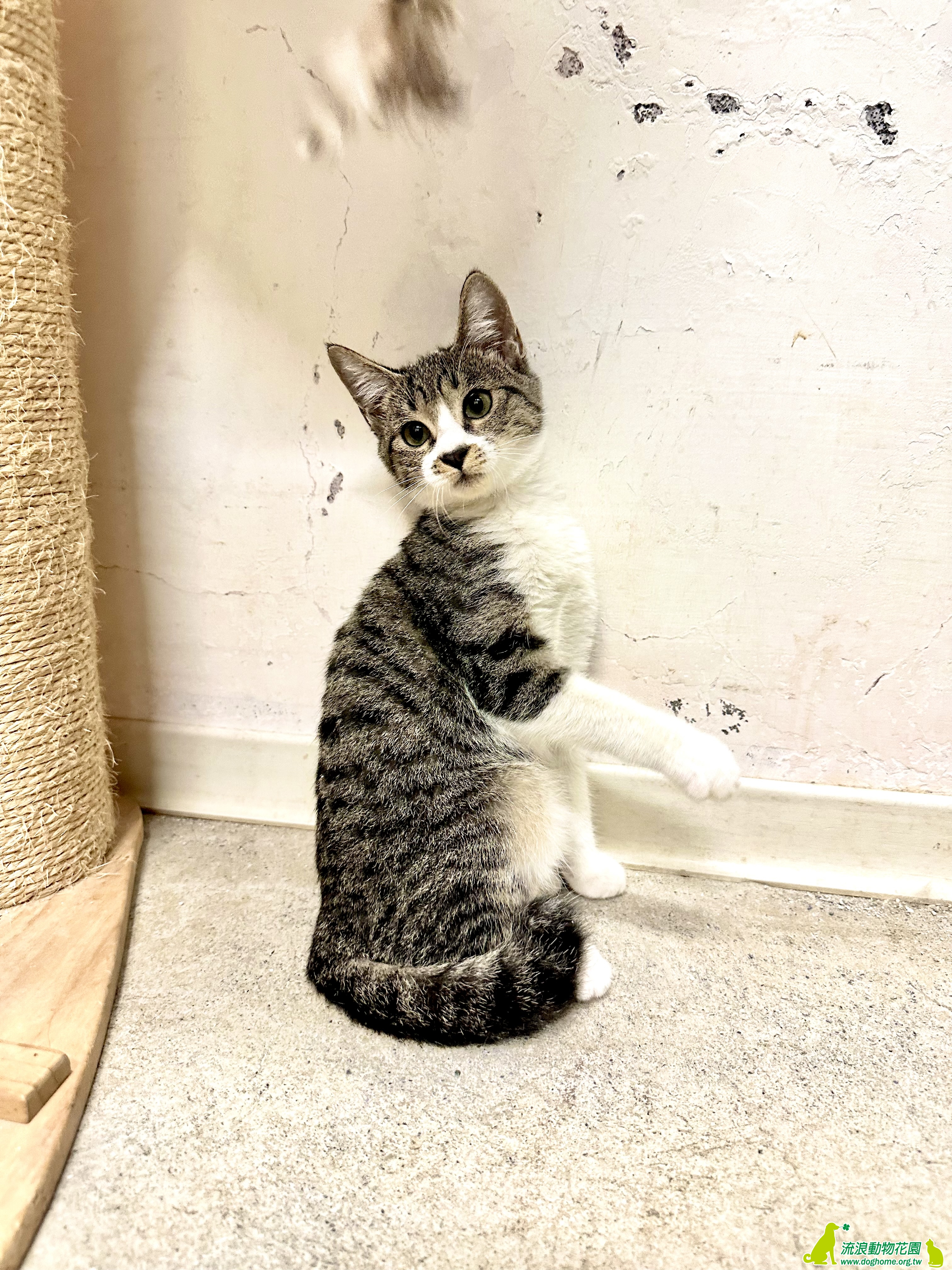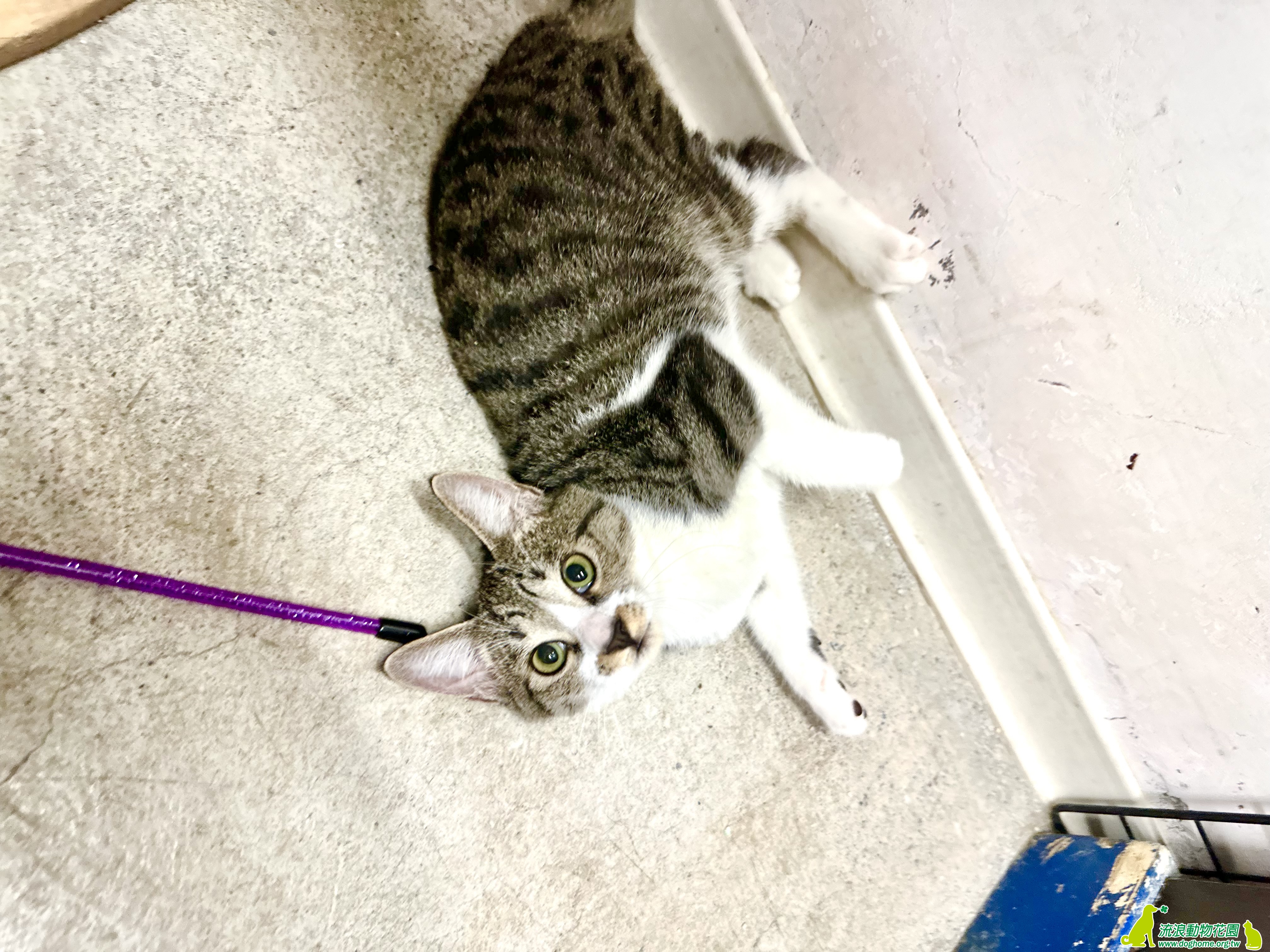 “小博”個性活潑好動非常愛玩,雖然不常討摸幾乎都是想找人玩,不過本身也很親人可摸可抱,剪指甲時只要搓一搓就會乖乖躺好並呼嚕。”小博”的白底虎斑中有個比較特別的地方是肚子有圍兜兜,虎斑紋剛好包裹住那圓滾滾的小肚子。