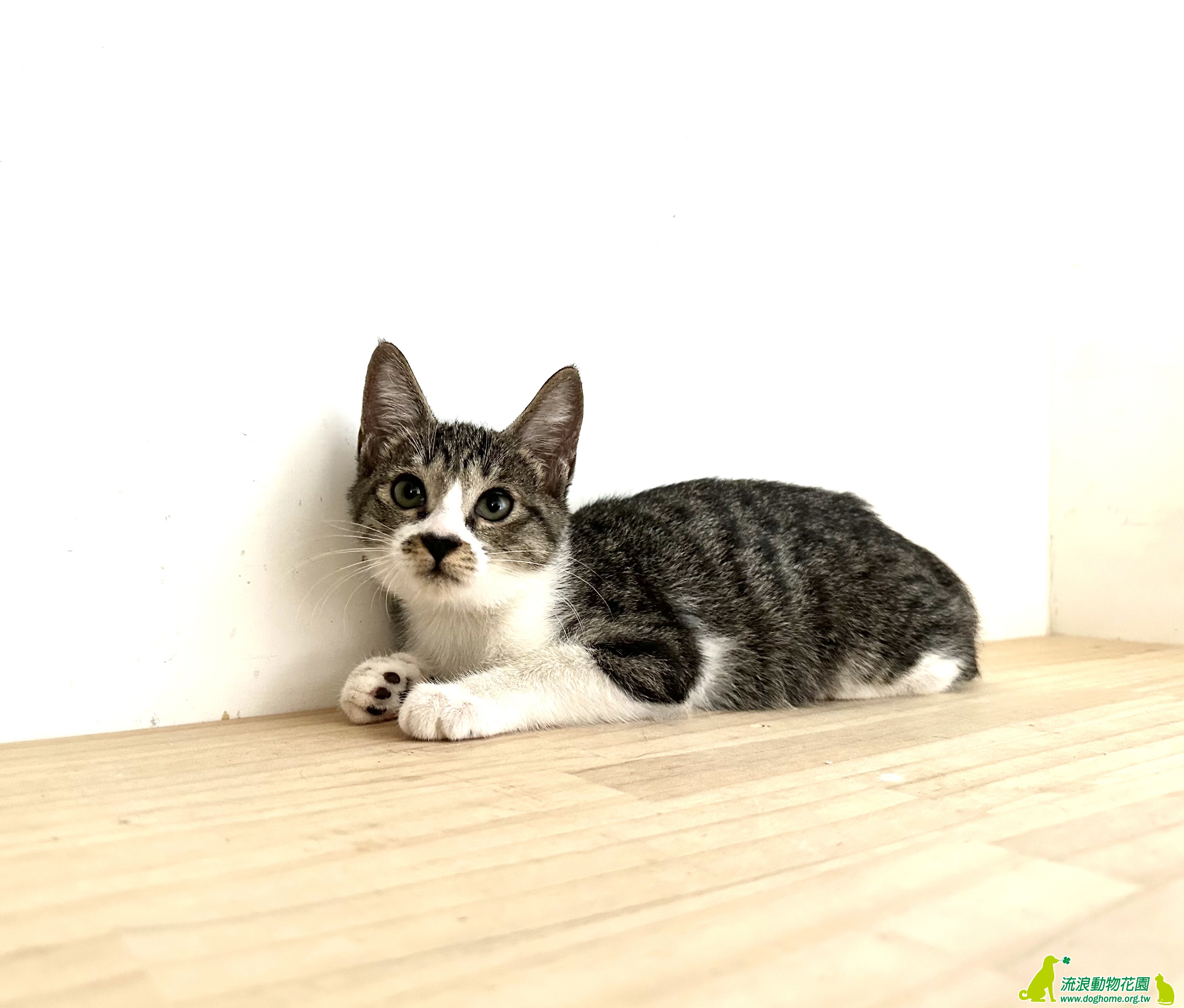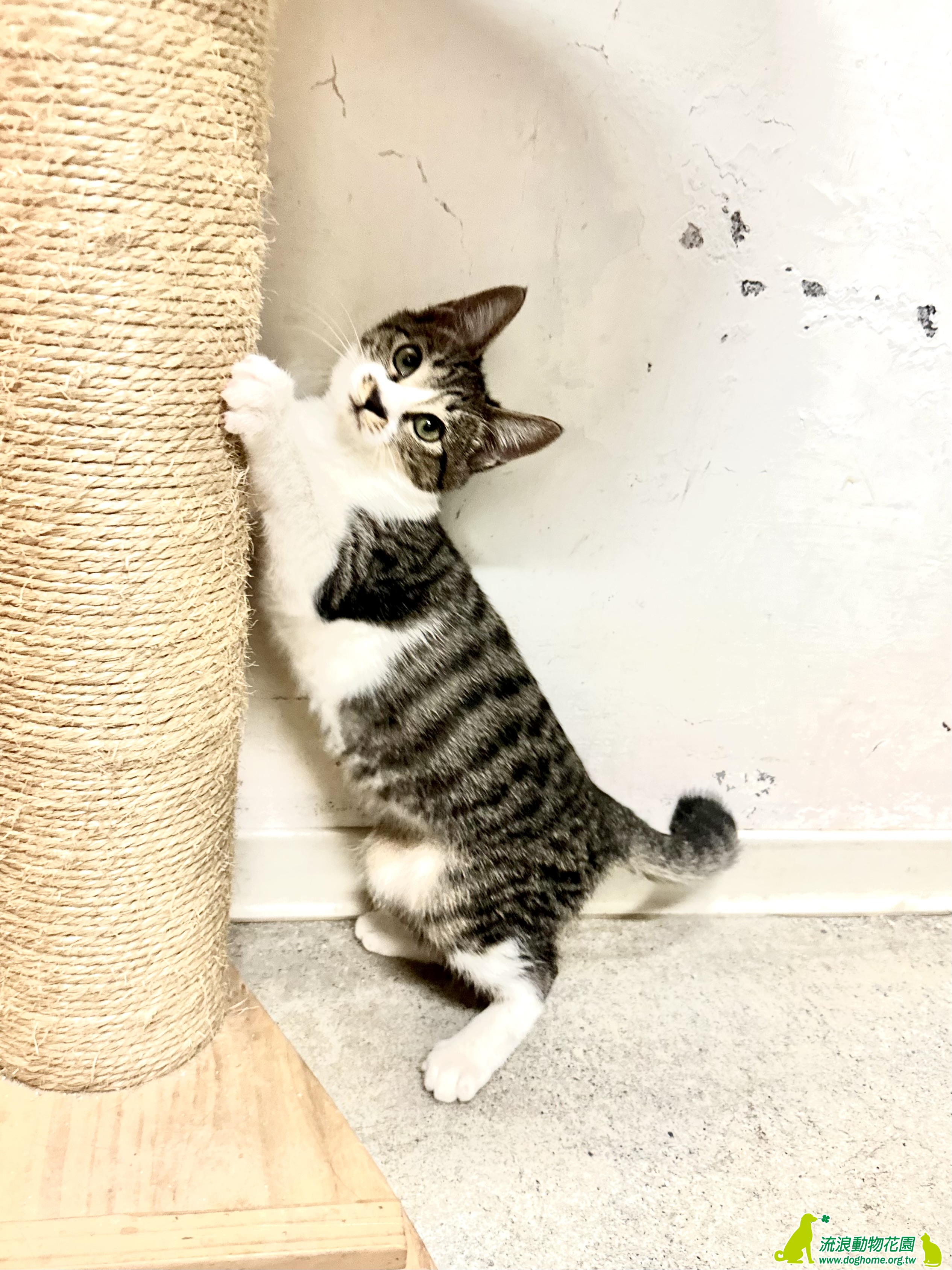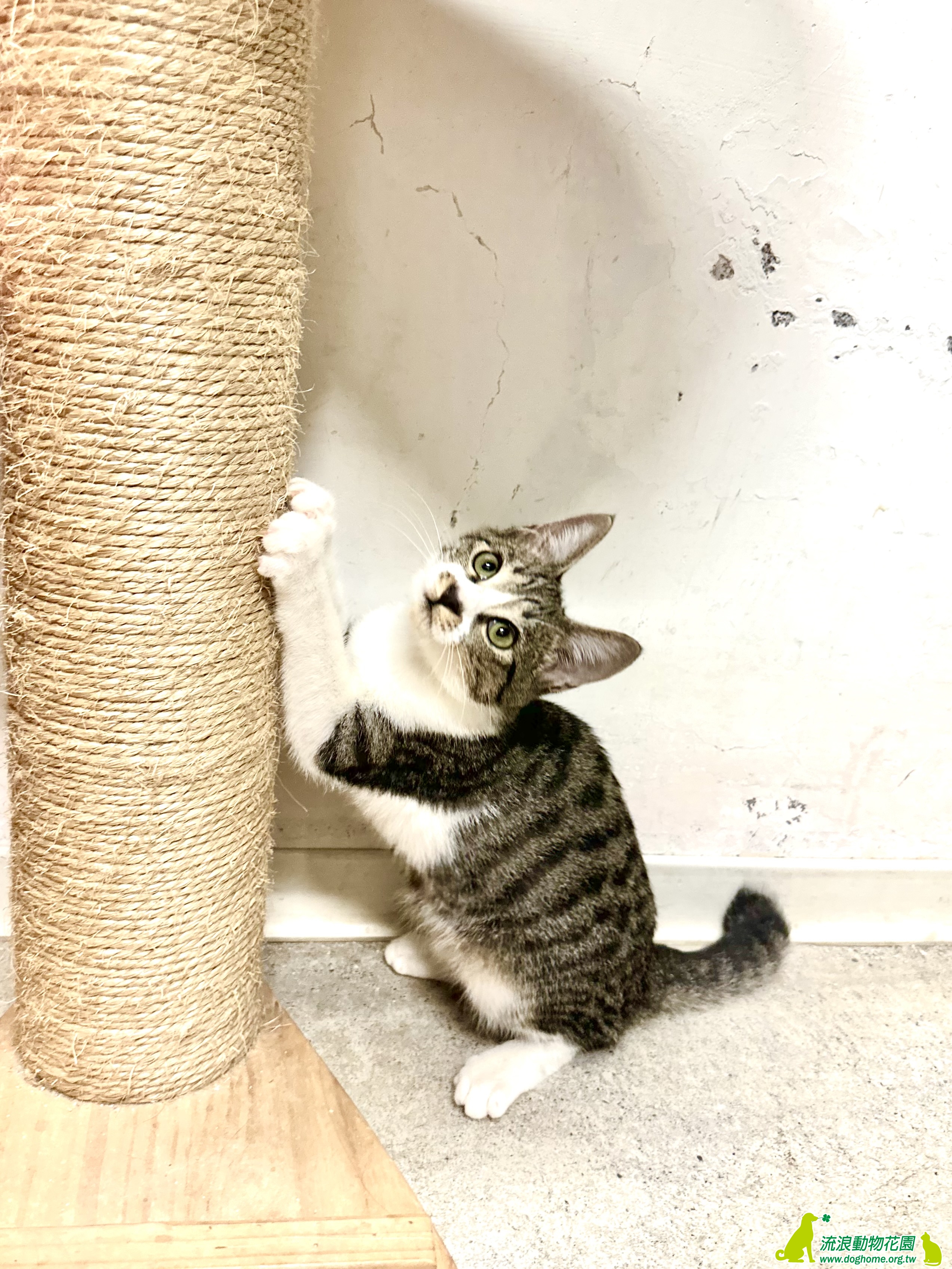 “小博”個性活潑好動非常愛玩,雖然不常討摸幾乎都是想找人玩,不過本身也很親人可摸可抱,剪指甲時只要搓一搓就會乖乖躺好並呼嚕。”小博”的白底虎斑中有個比較特別的地方是肚子有圍兜兜,虎斑紋剛好包裹住那圓滾滾的小肚子。
