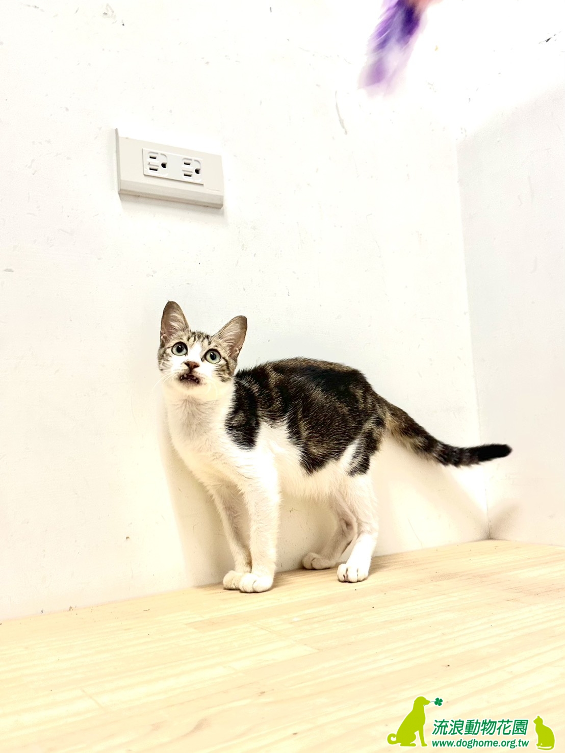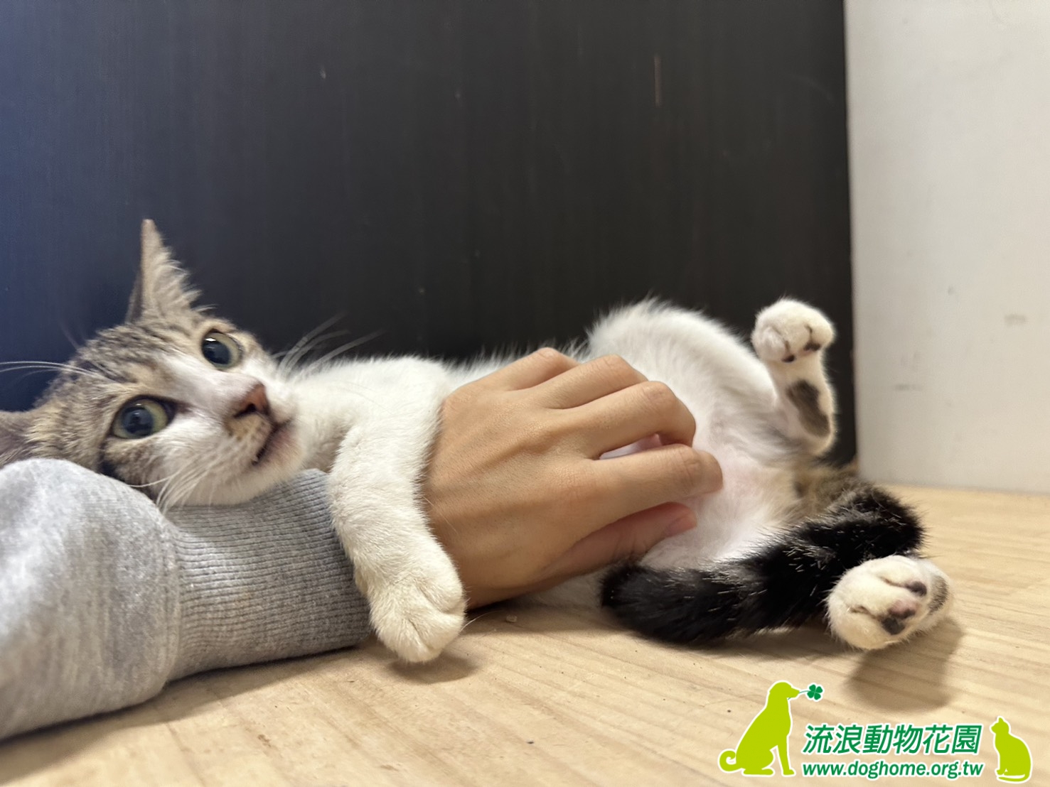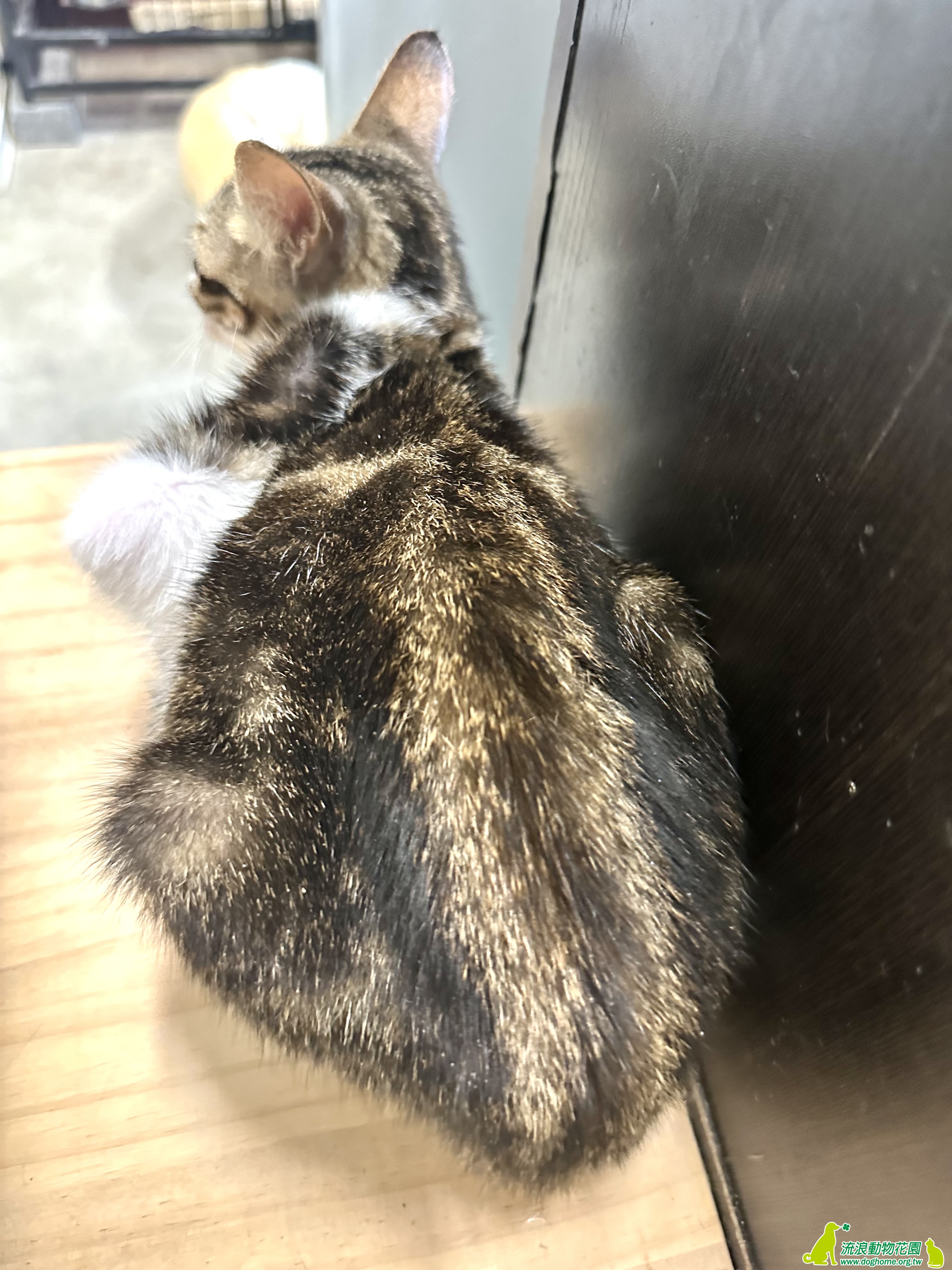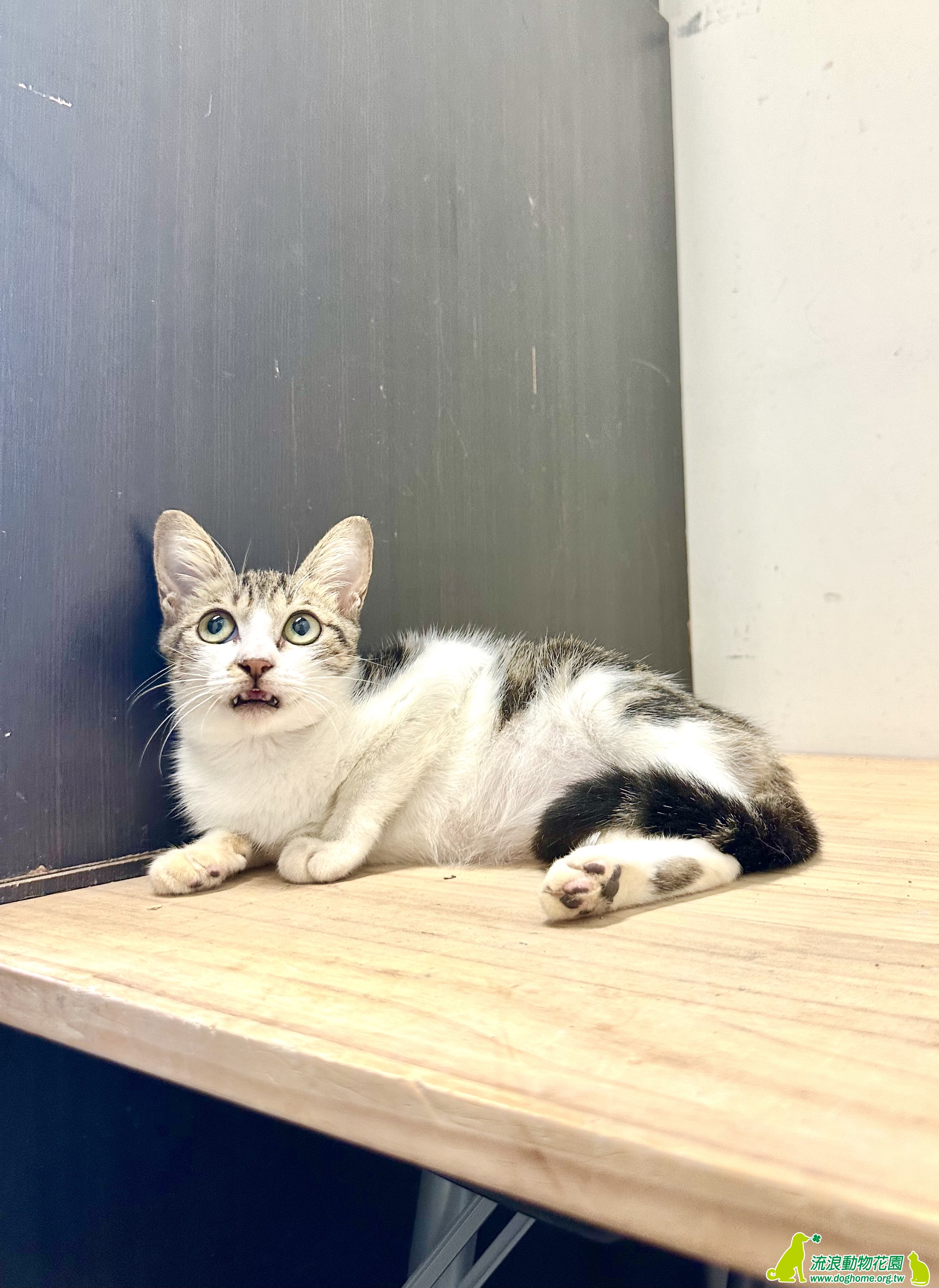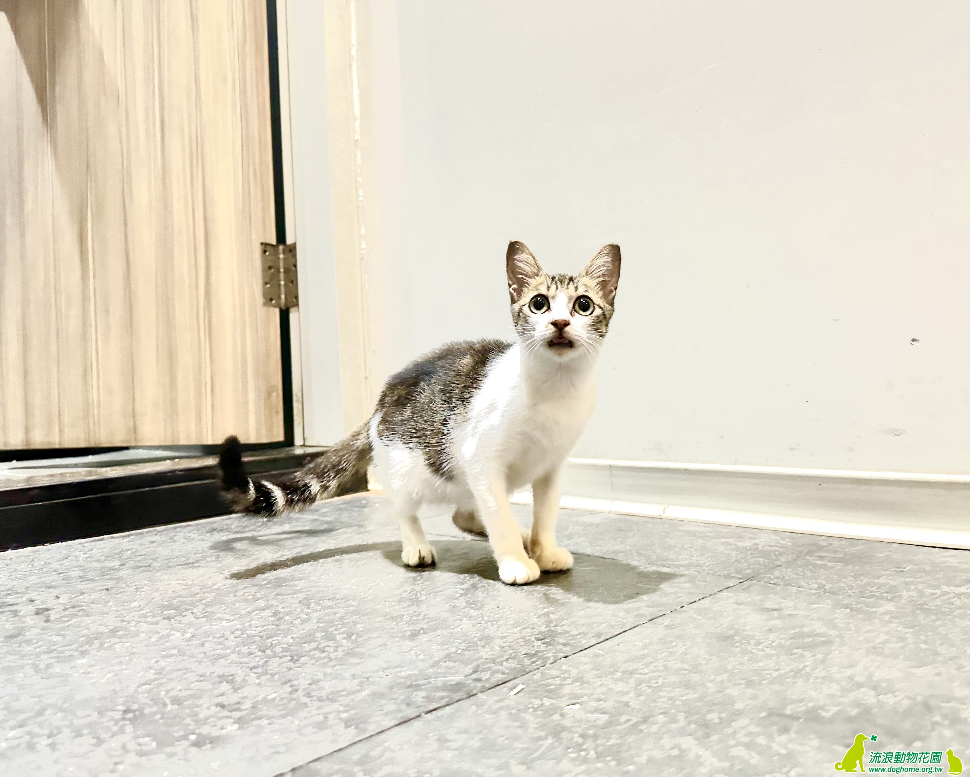 連日大雨,有一天傍晚在等垃圾車時聽到了喵叫聲,一看,竟然是一隻又瘦又小的貓,躲在同事的車旁,匆匆忙忙拿了罐頭和提籠,這不知道餓幾天的小朋友就傻傻地走進去籠子裡,不知道牠來自何處,但我們猜想是跟著協會定時餵養的浪貓來的。回到協會,趕緊幫牠洗熱水澡,抹去身上的髒汙和鼻頭結塊的分泌物,看起來有舒服許多,吹風的時候不停的呼嚕和喵叫,像是在道謝一樣。